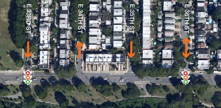 Avenue U in Brooklyn NY. @NYC_DOT traffic signals are not at every intersection, even though there are desire lines to the park and bus stops at every intersection. Does this mean when you get off the bus and cross the street where there is no signal, you are doing so illegally?